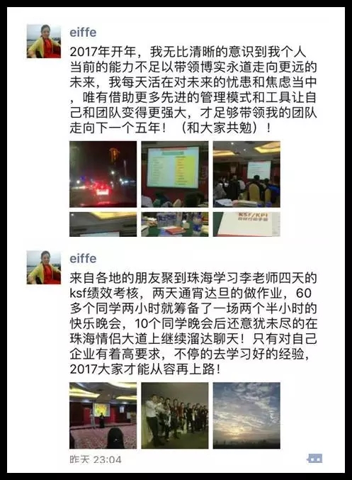 2017年,我們在一起!!! 同學們分別來自:北京、上海、江蘇、濟南、吉林、玉林、重慶、云南、清遠、福州、柳州、南寧、杭州、湖南、佛山、東莞、深圳、長沙、江西、濱州、珠海等21個地區34家企業的70位老板及高管們來到第79期《績效核能》課堂學習! 由于受到北方霧霾天氣影響,很多航班臨時取消,同學們坐高鐵經上海轉機、不遠萬里、幾經周折、突破重重困難,來參與課程學習。為這些愛學習的企業家朋友們點贊! 猴年最后一期課程圓滿結束,也是2017年的完美開局。很多感慨,無限感恩。還有更多的是期待、祝福。愿我們在新的一年里,經營好企業,平安快樂每一天。讓生命更加充實,讓事業發展到更高的境界。無愧于自己的努力,不辜負家人、同事的信任與期許。相信一切都會更好的!